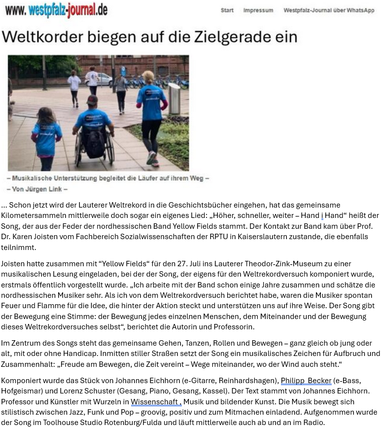 „Höher, schneller, weiter – Hand in Hand“ heißt der neue Song der Band Yellow Fields – ein mitreißender Aufruf zu mehr Bewegung im Alltag: gemeinschaftlich, inklusiv und voller Lebensfreude.